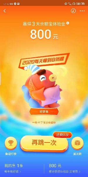 1、在支付宝的年年有余活动中,我们每一次的跳跃之后, 就会花费一次机会。