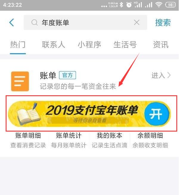打开支付宝——我的——账单——在顶部即可看到“你的2019年账单来了”——点击进入之后即可查看“年度账单”