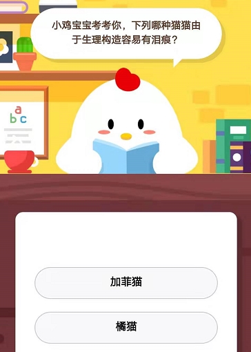 小鸡宝宝考考你,下列哪种猫猫由于生理构造容易有泪痕?可能还有很多小伙伴不知道什么猫猫由于生理原因容易有泪痕,下面就跟小编一起来看看今天的正确答案吧。