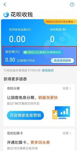 2.进去花呗收钱界面之后,可以看到150元以上订单收取0.6%服务费,150月以下花呗订单不收取服务费,