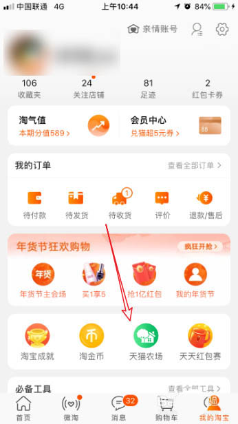2、打开我的淘宝页面后,点击页面如图所示的天猫农场图标