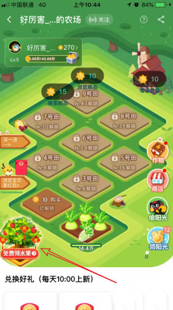 3、打开天猫农场后,即可在页面左下角位置看到有免费领水果了,点击它
