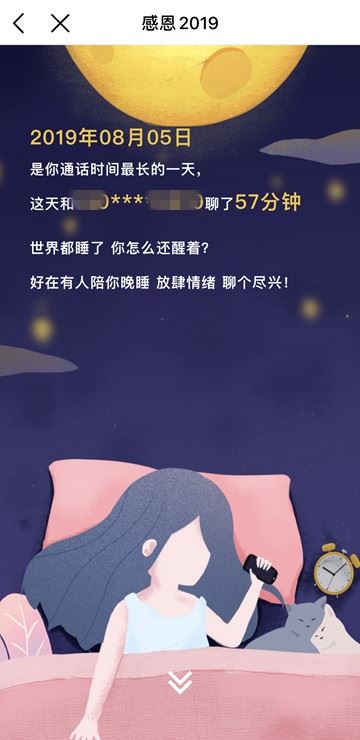中国移动手机APP内上线了主题为“感恩2019”的2019移动年度账单,包括用户第一次使用中国移动服务的时间、与用户通话次数最多的号码、通话时间最长的一天、参与的活动数量、留下足迹的地方数量等一年以来用户的主要数据。