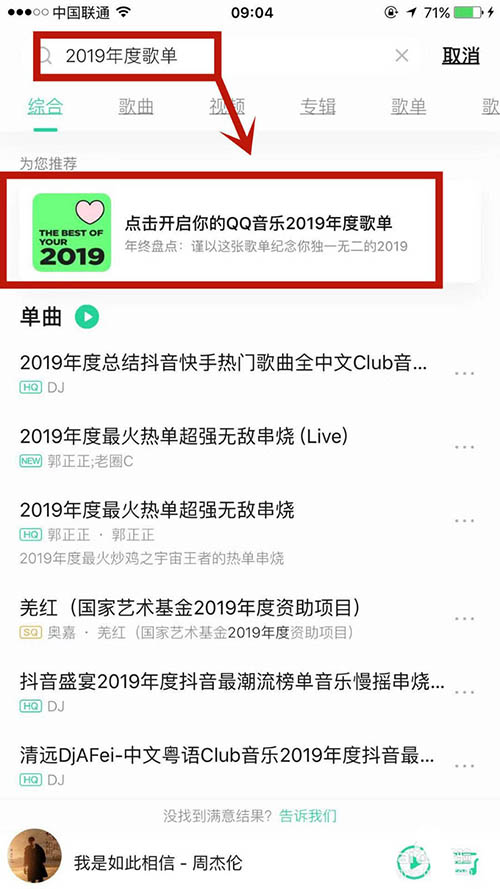 3、输入搜索2019年度歌单,找到后并点击进入。