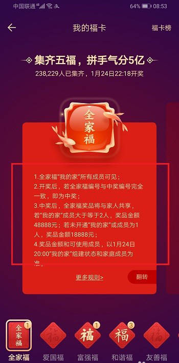 1、支付宝全家福卡编号和开奖号码一致就中奖,如果没有组建我的家或者组建我的家只有1人中奖金额是18888元,如果组建我的家且2人及2人以上,中奖金额是48888元