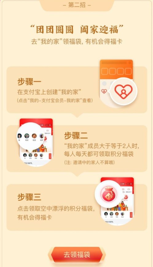 2、去“我的家”领福袋:在支付宝上创建“我的家”群组,当“我的家”成员大于2人时,每人每天都可以领积分福袋,福袋中有机会获得福卡;