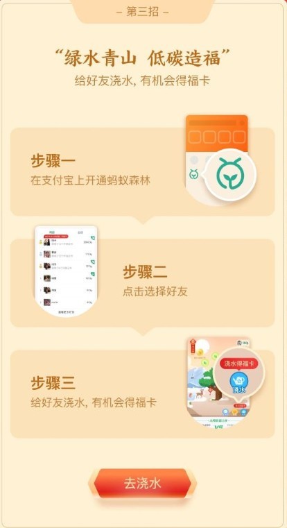 3、蚂蚁森林浇水得福卡:在支付宝上开通蚂蚁森林,给好友浇水,每天可得2张福卡。