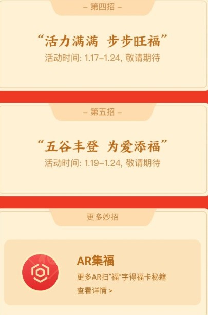 1、AR扫福:进入支付宝扫一扫,点击切换到AR扫描任意一个“福字”都可以获得福卡,每天可得2张福卡;
