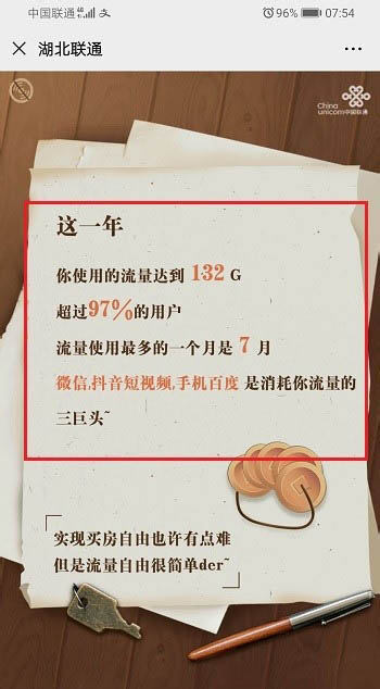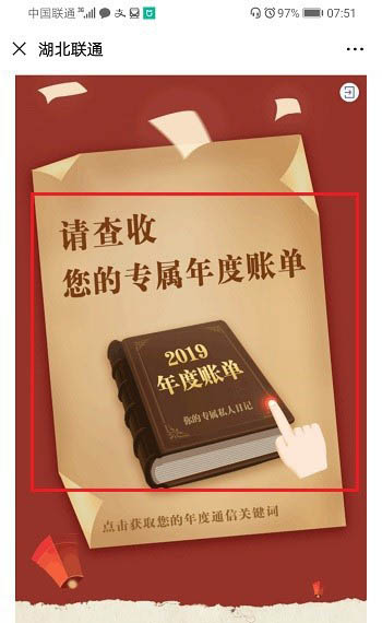 1、手机上打开微信,进去公众号,关注联通,找到2019年度账单,也可以直接发送2019年度账单信息,会自动出现
