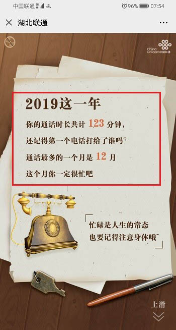 3、进去之后,可以看到我们2019年通话时间是多少,哪个月通话次数最多