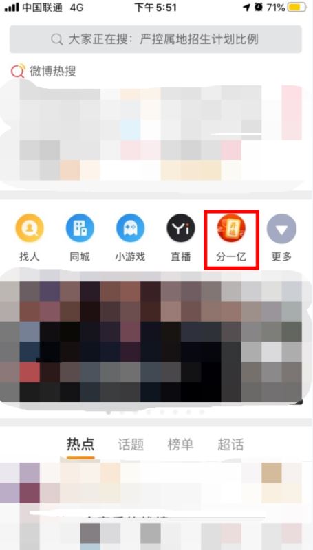 1、打开新浪微博APP后,点击下方的“搜索”图标,进入搜索界面后,就可以看到有个“分一亿”的活动,我们点击一下。