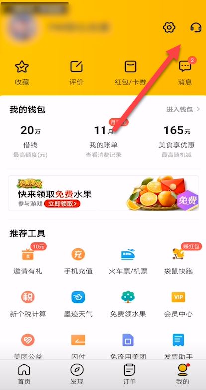 1、打开美团APP,在“我的”界面中点击右上角的“客服”图标,进入客服中心。