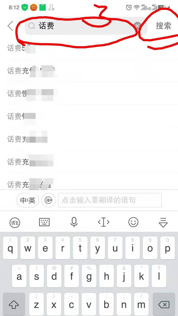 3、在上面搜索框里输入‘话费’两字,并点击右侧‘搜索’。