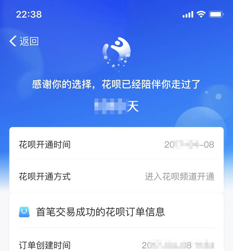 5、在这个页面,可以看到花呗的开通时间,以及开通时第一笔订单的信息。