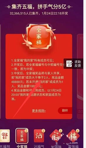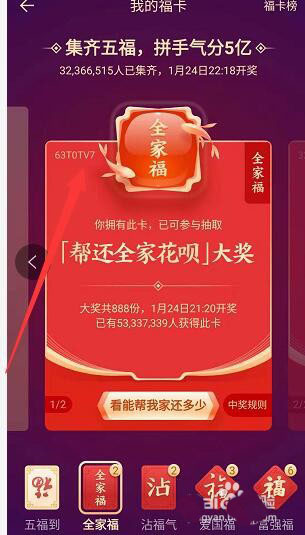 1、支付宝全家福卡我们看到是在1月24号的21:20来进行开奖了,开奖了以后,如果自己很幸运中奖了,这个是大好事情。