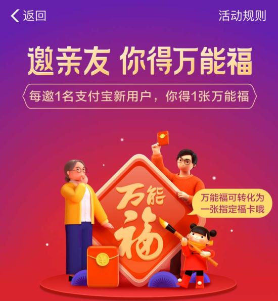 1、五福活动期间,每邀请成功1位支付宝APP新用户,可获得1张万能福卡,用户可以使用万能福转化出任意一张五福福卡【和谐、爱国、敬业、友善、富强】每张万能福只能使用一次,万能福一经转化不得撤销;若用户持有万能福但未主动转化,系统将在1月24日开奖前为用户转化,优先转化成用户所缺少的某类福卡【和谐、爱国、敬业、友善、富强】。