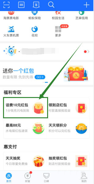 2、查看下方的【福利专区】,点击【话费10元红包】,此标志存在就代表可以参与活动。