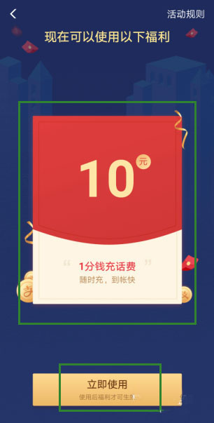 3、跳转页面,出现现在可以使用以下福利,以红包的样式出现,点击【立即使用】。