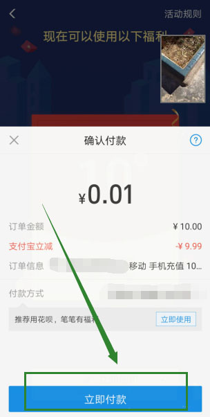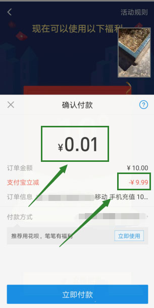 4、弹出付款窗口,可以看到“支付宝立减”9.99,现在需要支付的仅需0.01即可充值10元话费。
