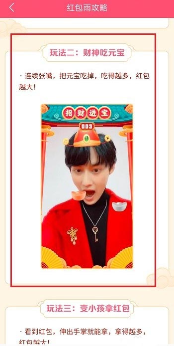 第二步2020年抖音红包雨有嘟嘟聚宝盆,财神吃元宝玩法,都是打开摄像头,然后做动作获得红包
