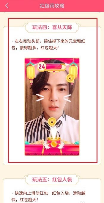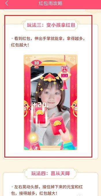 第四步喜从天降玩法,主要是打开摄像头,头部动作,左右晃动头部接住红包和元宝,接的越多获得的红包越大