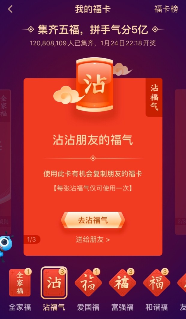 2、然后让好友把他除了敬业福之外的所有福卡先送给你,这个时候你再去用沾福气卡去沾这个好友的福卡,就能获得敬业福了。