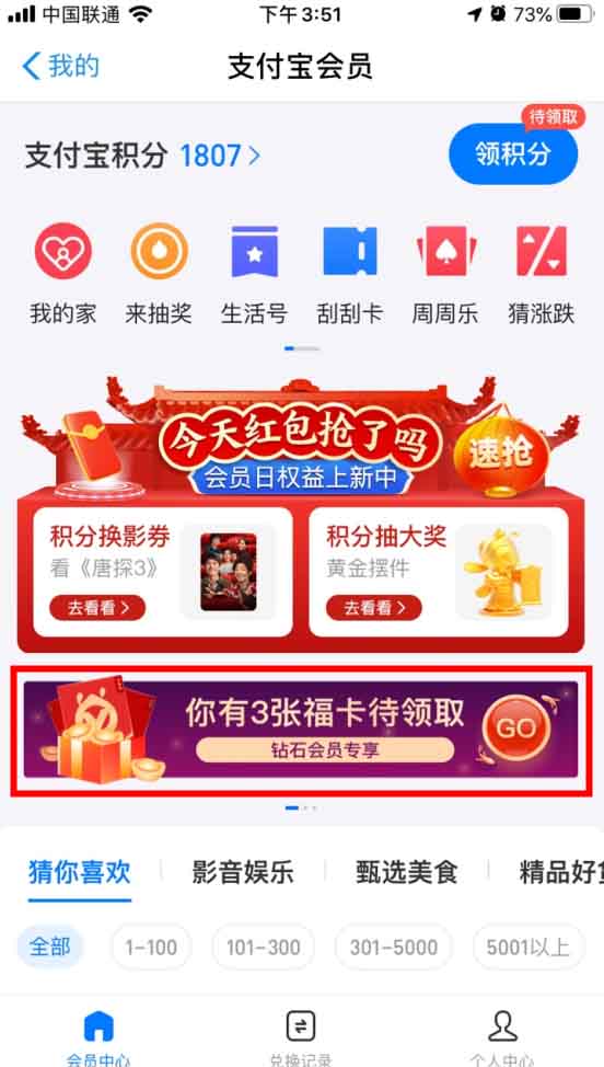 2、在支付宝会员中,向上滑动,可以看到“你有3张福卡待领取”活动,点击即可进入领取福卡。
