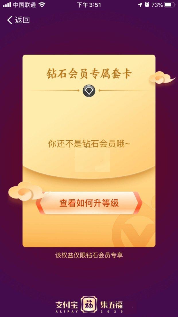 3、该福利为支付宝钻石会员专属卡套,分别是沾福卡一张,全家福卡一张,敬业福一张。小编还不是钻石会员,所以无法领取。