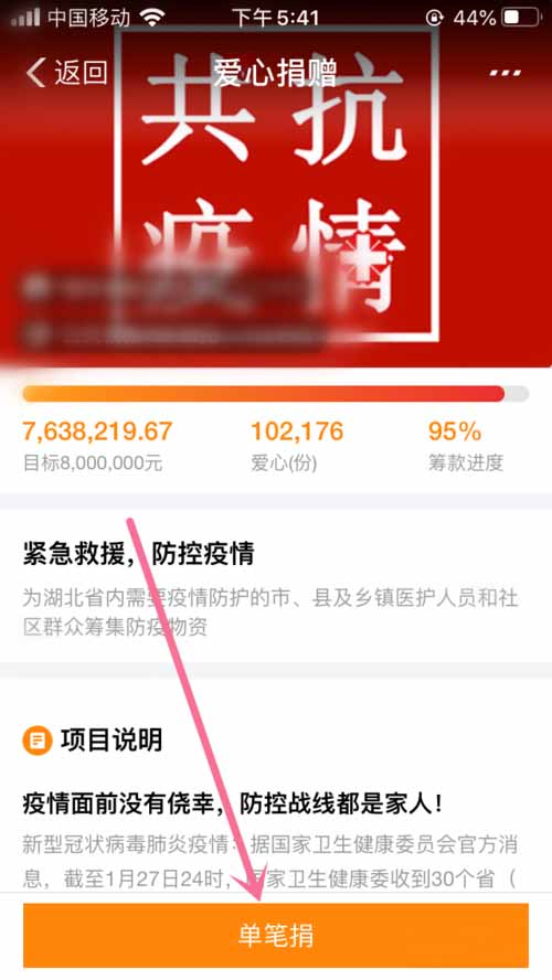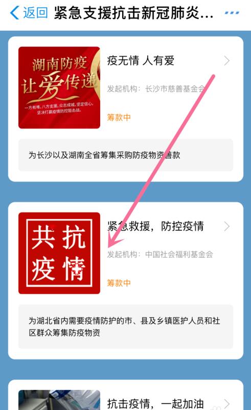 打开紧急支援抗击新冠肺炎的页面中点击“没有已筹满”的爱心捐助