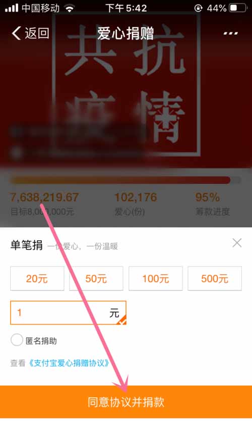 进入到爱心捐赠的页面中输入要“捐款金额”后点击“同意协议并捐款”
