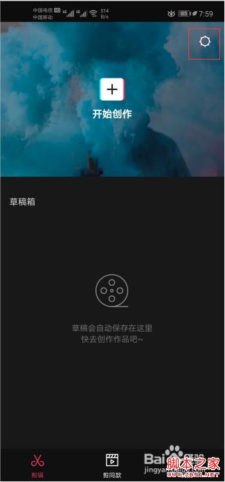 首先打开手机中的剪映软件,根据图示,找到右上方齿轮图标,点击齿轮图标,进入下一步操作。