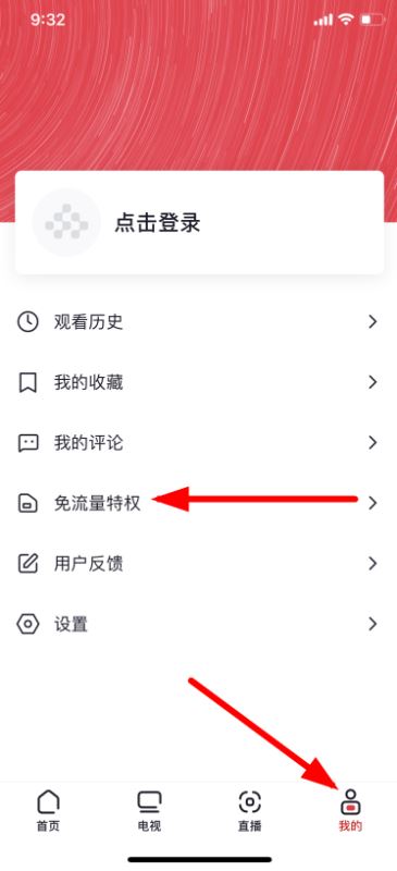 首先打开央视频app,点击我的。然后可以看到免流量特权,然后点击进入。