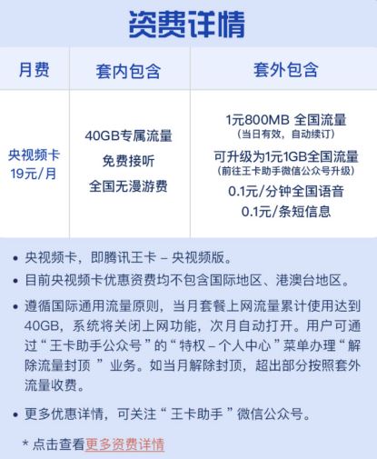 套内包含:40GB专属流量、免费接听、全国无漫游费