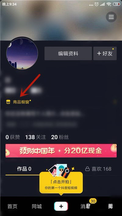 2、在个人主页中找到【商品橱窗】并点击。