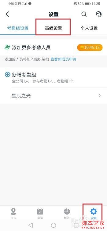 第二步进去考勤打卡界面之后,点击下方的设置,选择高级设置,如下图所示: