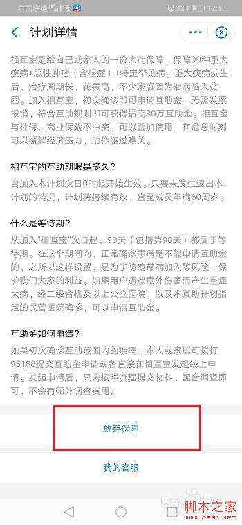 第五步在保障详情界面,下滑到底部,点击放弃保障,就成功取消相互宝自动扣费了,如下图所示: