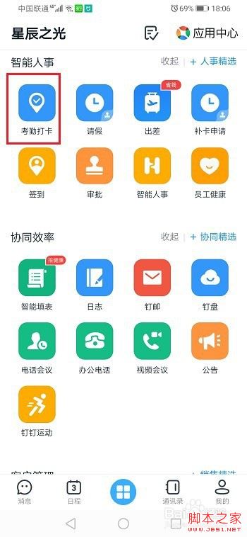 第一步手机上打开钉钉,点击考勤打卡,如下图所示: