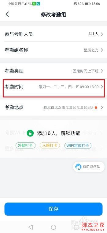 第三步进去考勤组设置界面,点击考勤时间,如下图所示: