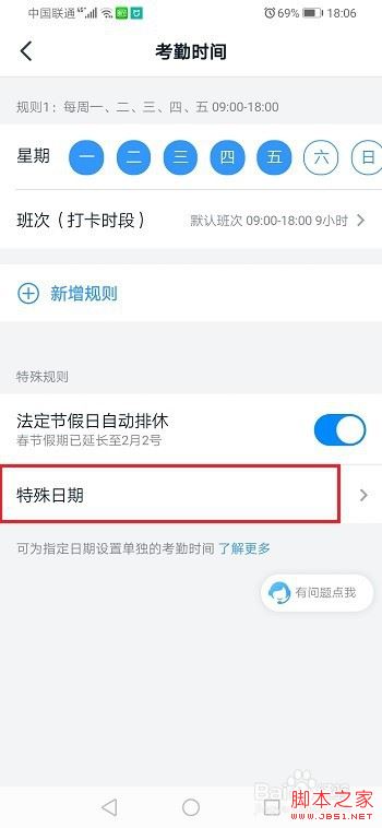第四步进去考勤时间界面,一般是每周一到周五打卡,我们可以设置特殊日期来不用打卡,如下图所示: