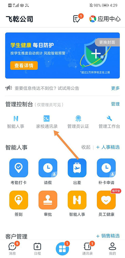 3、进入到“家校通讯录”界面,点击你创建的学校。(如果还没有创建家校通讯录,请先创建)