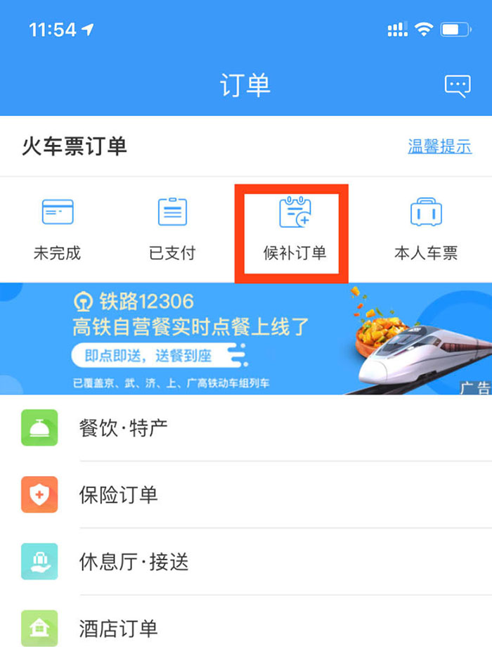 2、进入12306订单页面后,点击火车票订单中的“候补订单”。