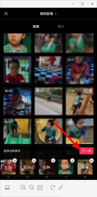 2.从相册选择18段素材,点击“下一步”。