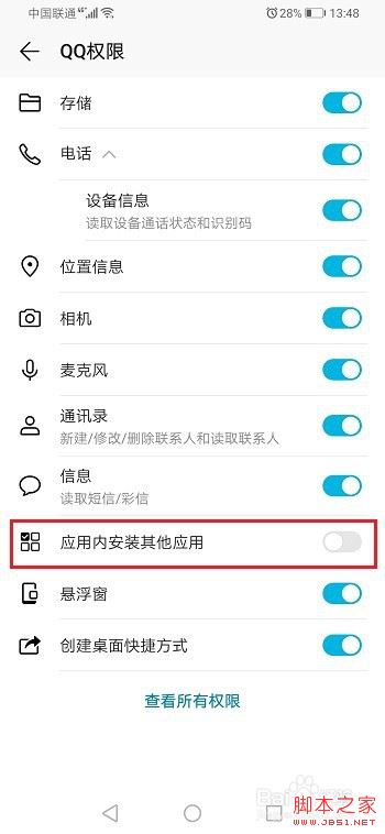 第五步进去qq权限界面之后,关闭应用内安装其他应用权限,这样就取消qq自动下载安装微视了,如下图所示: