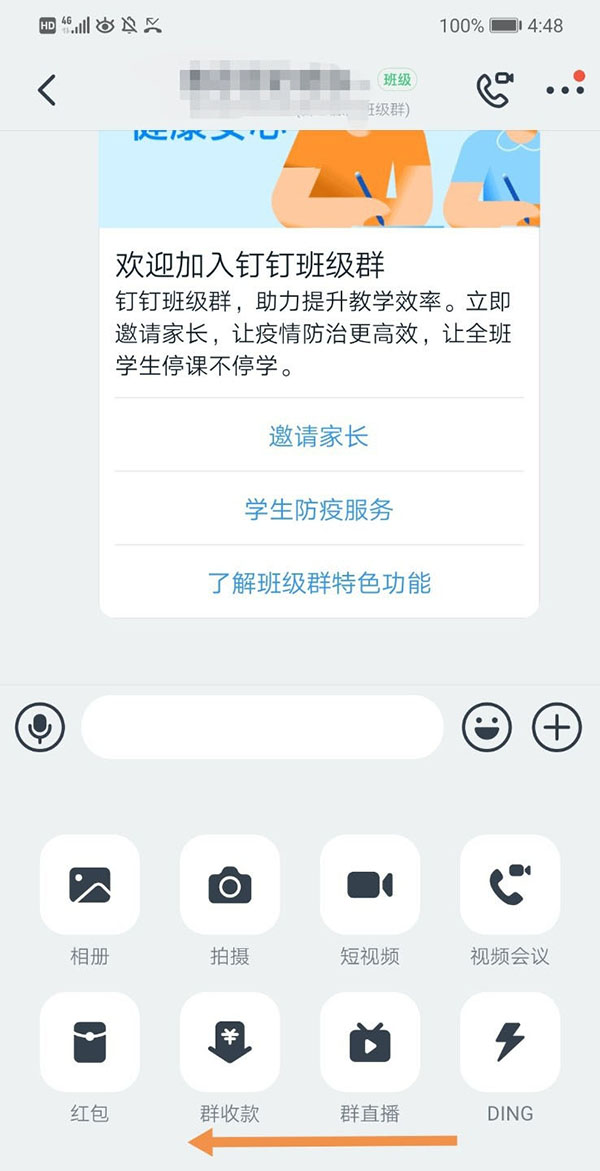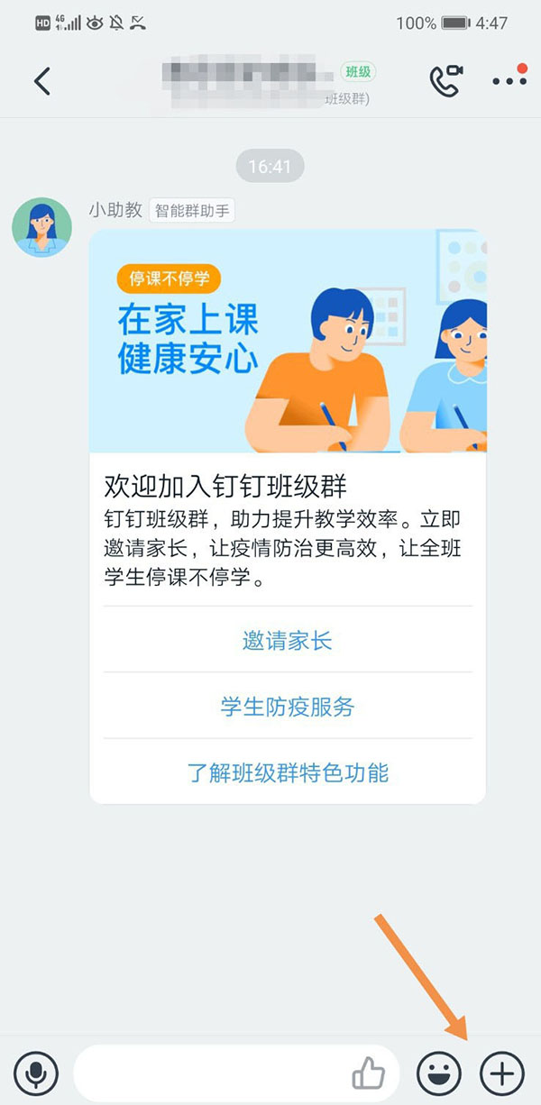 1、打开你要布置作业的钉钉群,点击界面右下角的“+”。