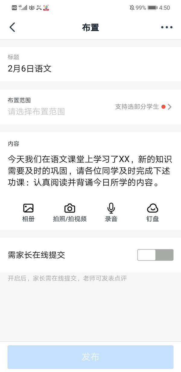 6、设置作业标题、布置范围、内容等信息,点击“发布”即可。