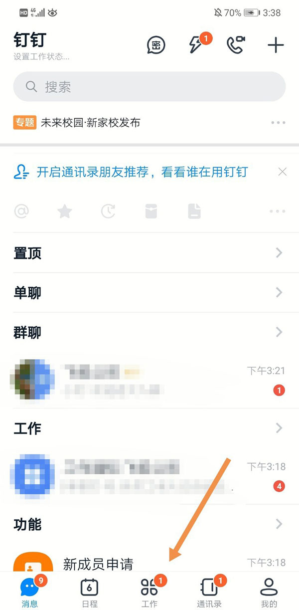 2、进入到“工作”界面,点击“家校通讯录”。