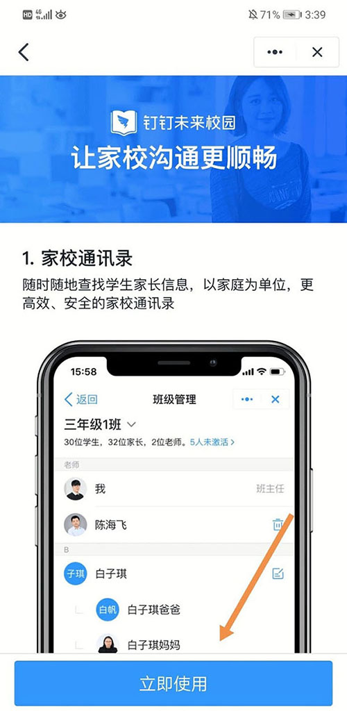 3、进入到“家校通讯录”界面,点击“立即使用”。