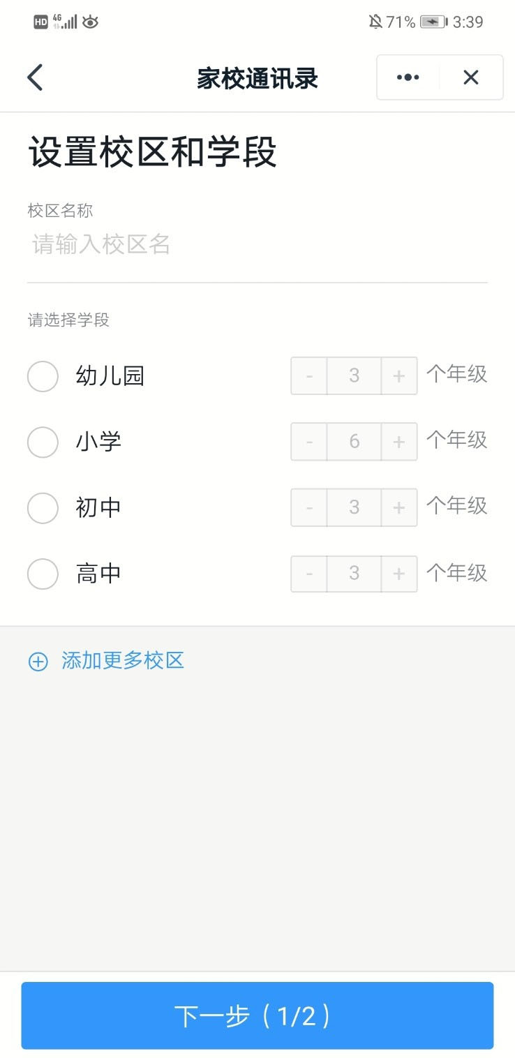 5、再设置校区名称和学段,点击“下一步”。