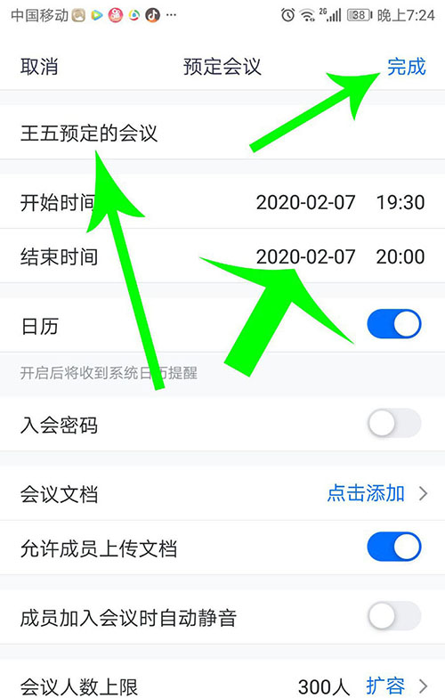 3、打开预定会议界面设置会议名称、时间,然后点击“完成”。