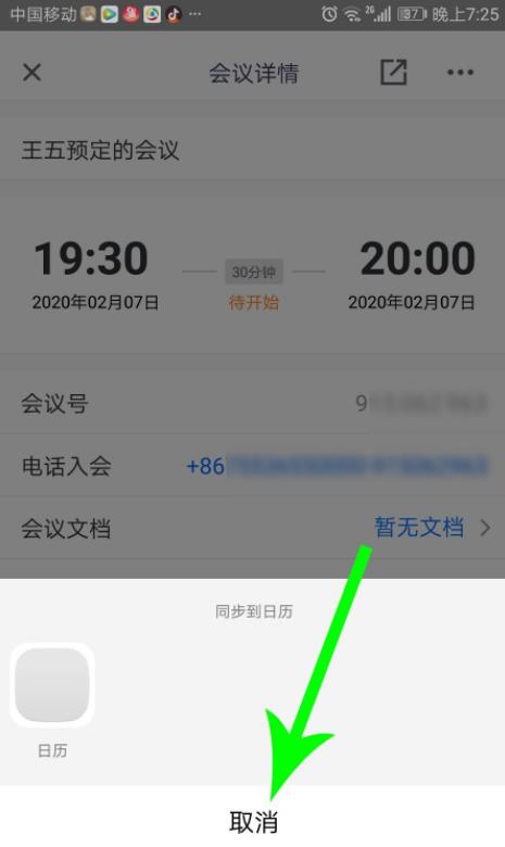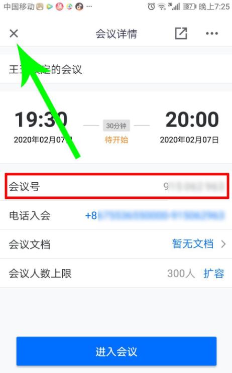 4、打开会议详情界面点击“取消”,然后检查会议设置,检查无误后将会议号和开会时间告知参会者,然后点击“×”关闭界面。